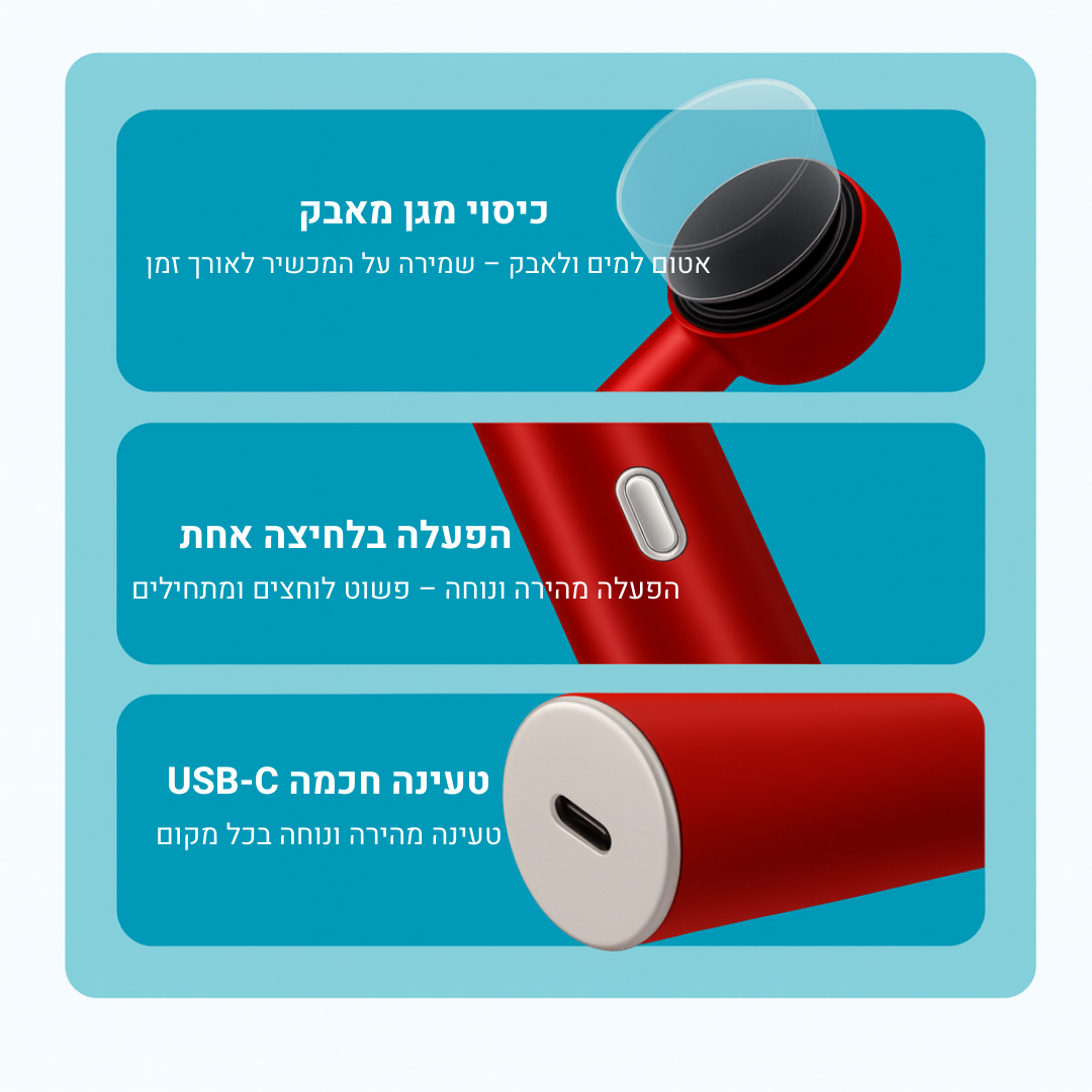 ממלאים נוזל, מפעילים בלחיצה ארוכה, בוחרים מצב עיסוי ומעסים ישירות על הקרקפת בתנועות איטיות.